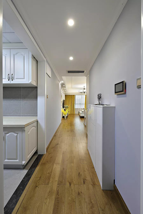 玄關(guān)處白色的小鞋柜,讓小空間具有實用的收納和裝飾功能。木地板與白色背景形成鮮明對比,整體讓人感覺落落大方,回到家就能感受到暖心的氣息。