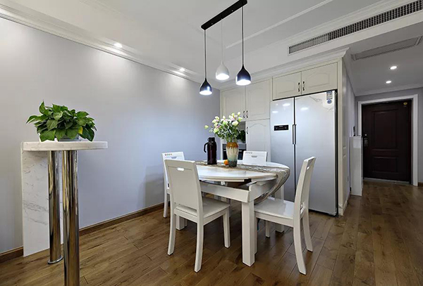 餐廳這張白色實木餐桌椅,邊角可以折疊,無論人多人少都能駕馭。白色的餐邊柜,冰箱嵌入到中間,顯得格外的優(yōu)雅端莊。
