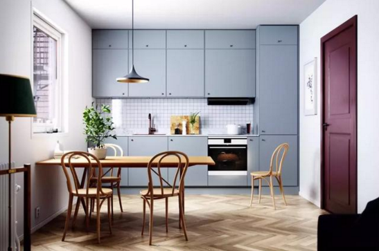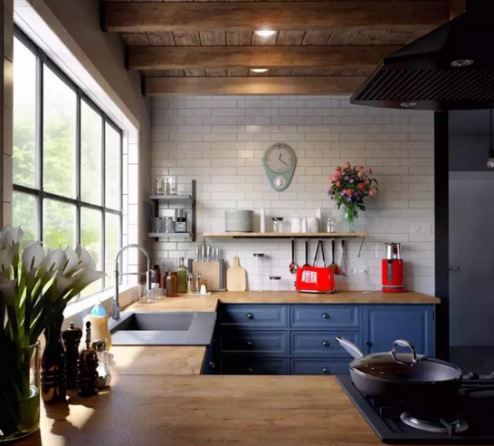 1、藍(lán)色+原木色系廚房