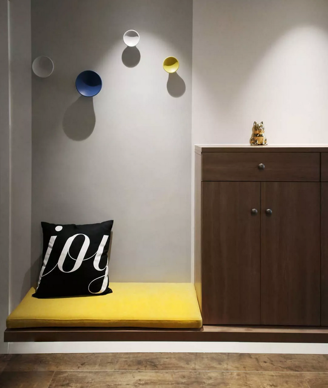 換鞋座與鞋柜都做了掛墻式,沒有落地柜腳的障礙,掃地擦地順暢很多;由于門廳光線弱,柜體離地也有利于客廳的光線更多的傳遞到門廳。當(dāng)然輔助光源一樣不可少。
