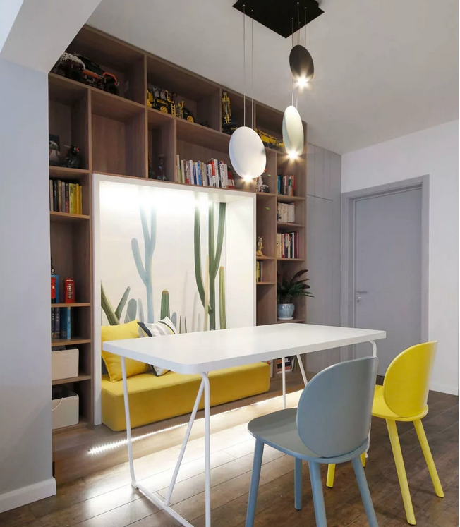 餐廳的位置比較暗,運(yùn)用隱藏式輔助光源改善光感,軟裝采用綠色與黃色做點(diǎn)綴賦予生機(jī)感。墻面的異形置物架又能滿足儲(chǔ)物與展示的需求。