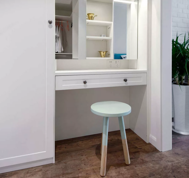 利用主臥富裕的面積加出來的衣帽間兼梳妝區(qū),有單獨(dú)的燈光照亮梳妝區(qū)。請(qǐng)不要問我梳妝臺(tái)的鏡柜門正好中間那塊沒有怎么照,其實(shí)那塊壞了拿去維修了……