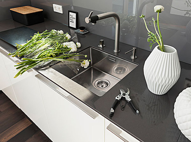 石英石也是目前漸漸流行起來的材質(zhì),不怕高溫、不怕染色,跟同樣常見的石英石臺(tái)面還能一體化搭配,做到無縫銜接。但缺點(diǎn)就是質(zhì)地沒有不銹鋼材質(zhì)堅(jiān)硬,整天接觸金屬廚具容易擦蹭。除了石英石還有花崗石等,但是天然石材比較昂貴,動(dòng)輒10000+……