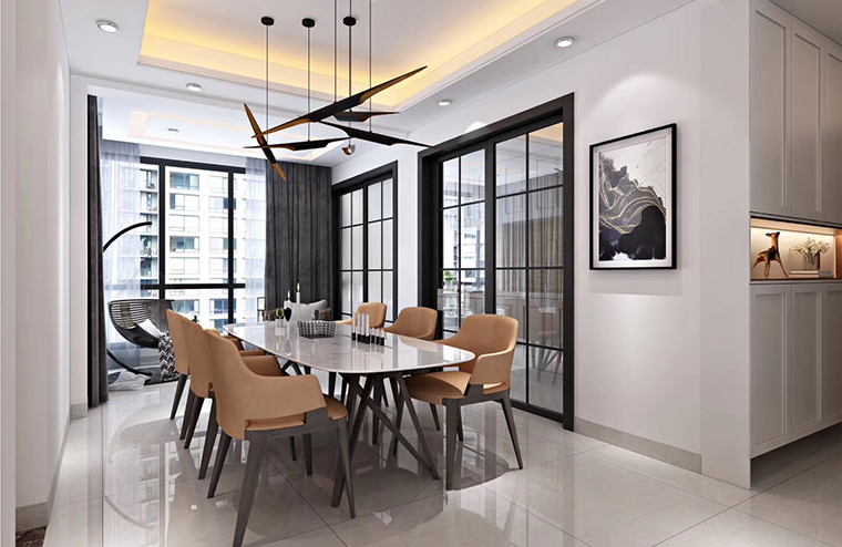 對于采光不好的餐廳來講,如果只是利用光源設(shè)計來進行調(diào)整與改變,要知道餐廳裝修過程中本來就是忌諱使用大量的光源,這會使人們在就餐時感到非常不舒服,而采用現(xiàn)代簡約的裝修風(fēng)格,就算只是在一盞水晶吊頂的搭配下,也會令餐廳的光線十足,如圖,采用不吊頂?shù)暮喲b,但是天花板以淺色系的白色主打,配以淺色的地板,會令整個空間顯得簡約而明亮,搭配以淺咖啡色的餐廳背景墻裝修,又令整個餐廳空間不那么單調(diào)與空洞。