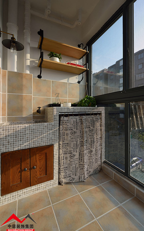 陽光照射地磚顯得陽臺更加溫暖,棕色的柜門凸顯,洗漱旁擺放著綠栽,給人起到了放松舒適的感覺。