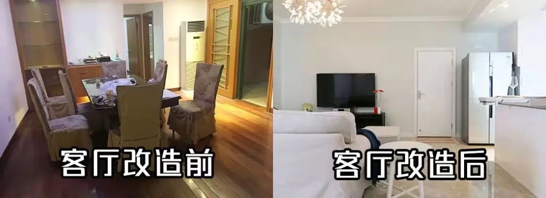 房屋改造前,客廳昏暗,看起來很小,陳列柜很占地方。餐廳和客廳為一個共通空間,顯得比較亂;客廳多為木質家具,看著陳舊。