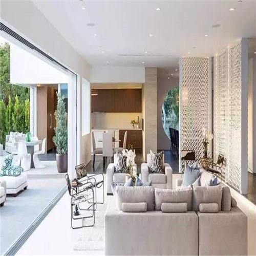 1、長條形的客廳在與餐廳等隔斷時(shí),應(yīng)避免采用硬隔斷,因?yàn)楸緛砜臻g就小,硬隔斷會使客廳看起來像個(gè)箱子一樣,給人壓抑感,而且也有可能影響采光。開放式的客廳餐廳可能效果會更好一些,不管是休閑還是吃飯,都不會覺得擁擠。對于不喜歡開放式的朋友來說,可以使用軟隔斷,比如用一個(gè)簾子或者鏤空的屏風(fēng)等,效果都會非常不錯。但是隔斷物的顏色不易太過厚重,以簡潔輕快為好。