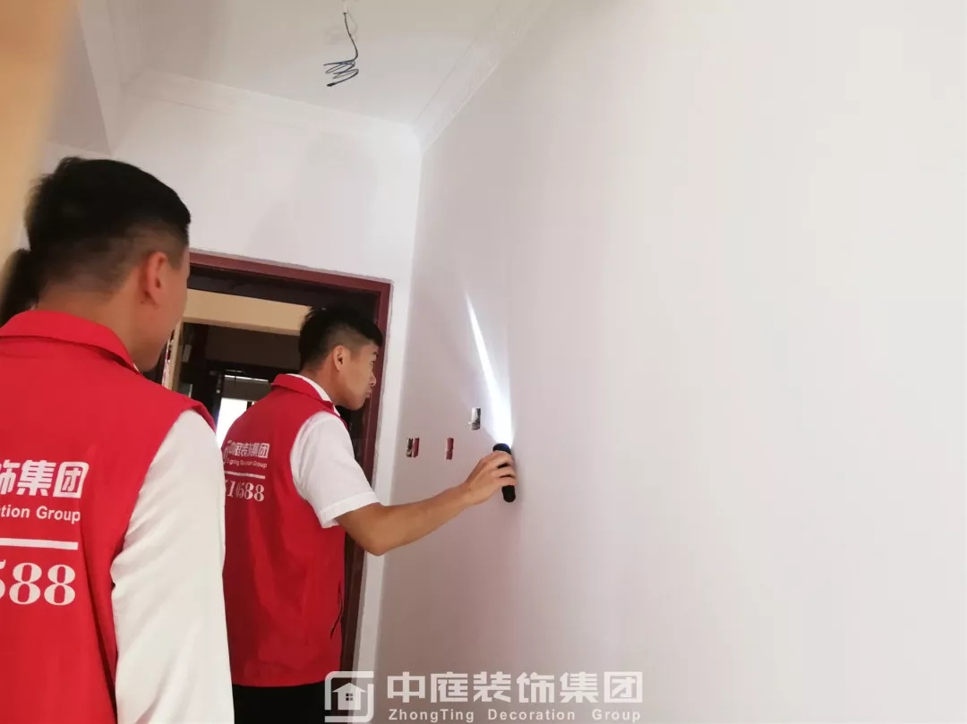 利用強(qiáng)光手電筒檢查墻面平整度及陰角是否達(dá)到集團(tuán)施工標(biāo)準(zhǔn)