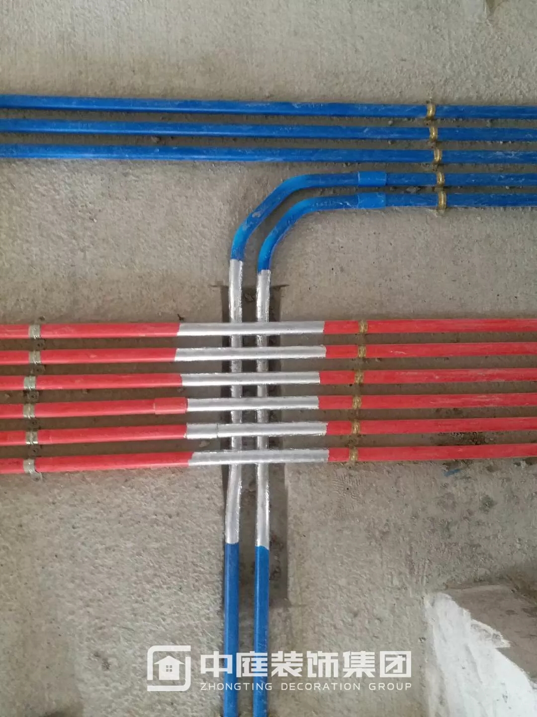施工現(xiàn)場線管鋪設(shè)橫平豎直,按照集團施工規(guī)定使用鐵皮卡扣固定,管和管之間留有足夠縫隙,以便鋪設(shè)地磚時水泥砂漿進入管下,避免地磚后期出現(xiàn)空鼓;