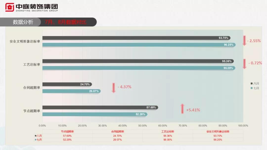 在總結(jié)8月份工作上,項目經(jīng)理個人月度達(dá)標(biāo)率和客服回訪業(yè)主評分成為衡量他們月度工作的指標(biāo),每到這個環(huán)節(jié),大家的心都懸到了喉嚨眼,但凡工藝達(dá)標(biāo)率和安全文明形象達(dá)標(biāo)率沒有達(dá)到90%及以上的,都要上臺面向所有人承諾,下月勢必做好工地管理,雙向達(dá)標(biāo),否則按制度處罰!
