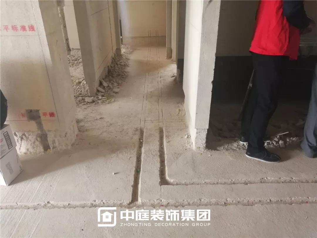 施工現(xiàn)場線管鋪設(shè)橫平豎直,按照集團施工規(guī)定使用鐵皮卡扣固定,管和管之間留有足夠縫隙,以便鋪設(shè)地磚時水泥砂漿進入管下,避免地磚后期出現(xiàn)空鼓。