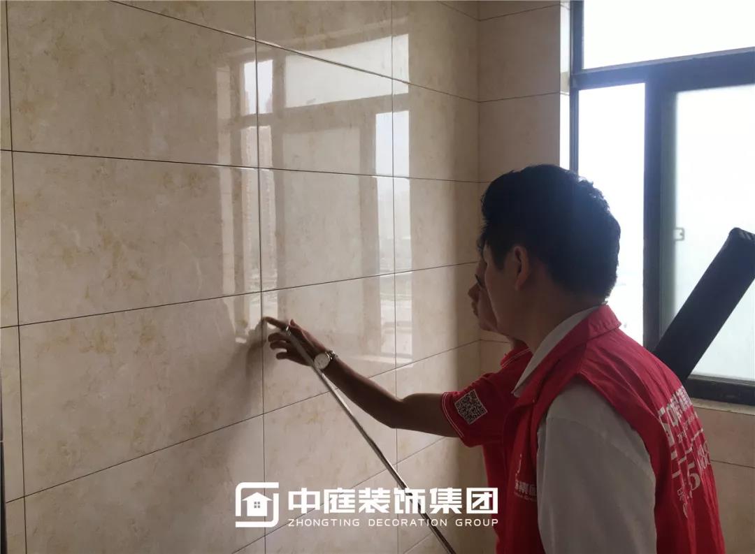 檢查瓷磚鋪貼是否平整干凈,有無錯貼漏貼;以及鋪貼縫隙是否均勻,有無缺角、裂紋。