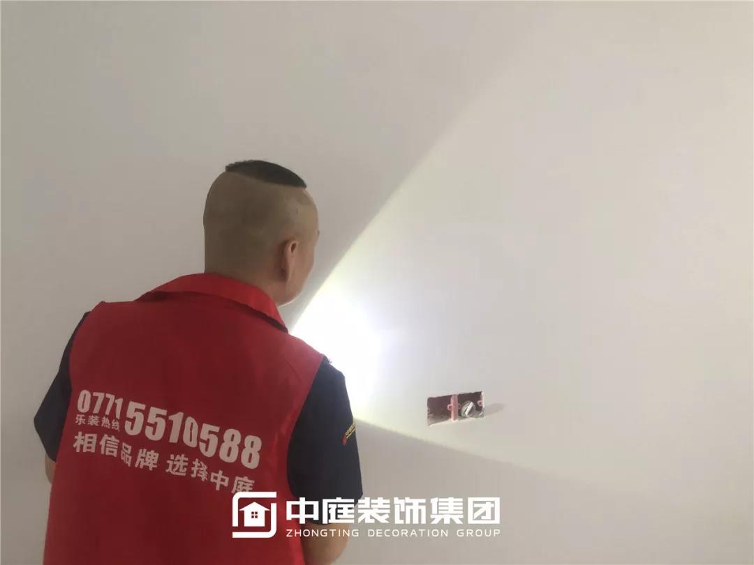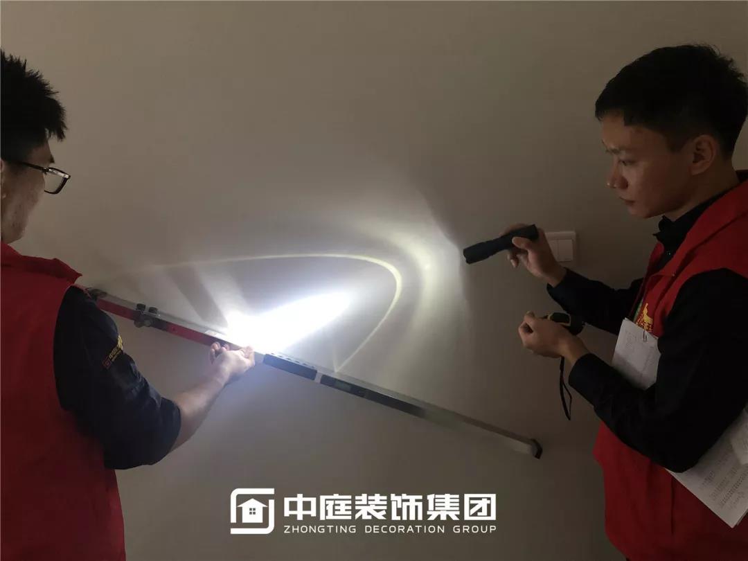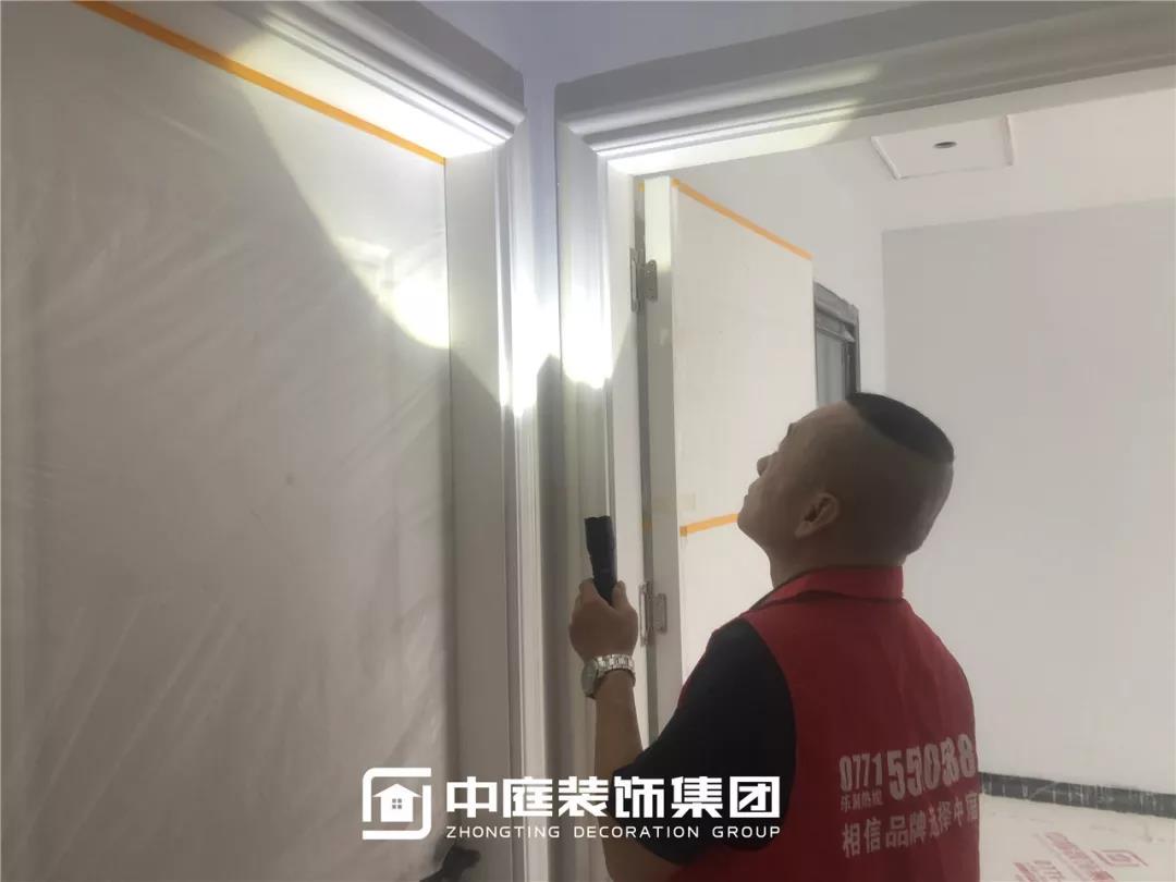 使用強光手電檢查陰角膩子施工打磨情況,工地大巡檢,不放過任何一個角落