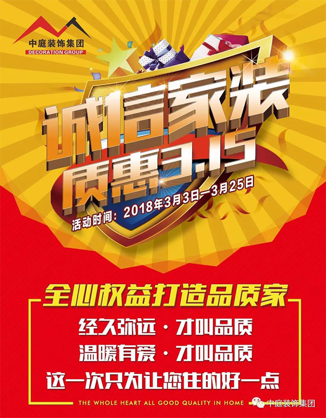 誠信家裝,品質宣言,我宣誓:誠信中庭人,從我做起,我愿意遵守公司誠信承諾,以客戶滿意為第一原則,讓百萬家庭享受快樂裝修。誠信315,在消費陽光下,中庭裝飾集團向您鄭重承諾: