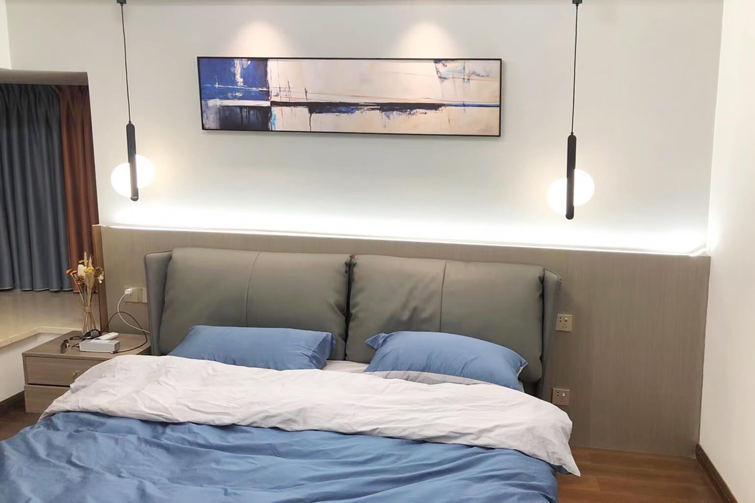客餐廳選擇素色的木飾面顯現(xiàn)低調(diào)有內(nèi)涵,整個客廳及餐廳的吊頂直接一體貫穿,搭配著電視背景墻長方體設(shè)計突顯空間的寬闊大氣,愛馬仕橙色的窗簾及單人沙發(fā)的呼應(yīng),增添了空間的活躍性;暖黃色燈光下白色的大理石吧臺及白色的高光柜門使得空間不再昏沉,局部黑色的鈦金夾著茶色的鏡面在大面積的素色木飾面的包裹下將現(xiàn)代的低調(diào)且奢華體現(xiàn)完美的體現(xiàn)了。