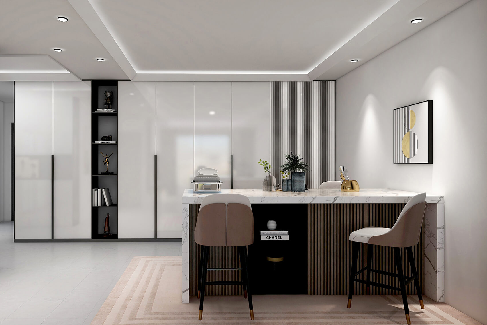 瀏覽量:402本案總面積134㎡。本案設(shè)計師以低飽和度色彩點綴空間,整體簡約大氣,輕奢的家居擺件讓整個家居環(huán)境更有質(zhì)感。