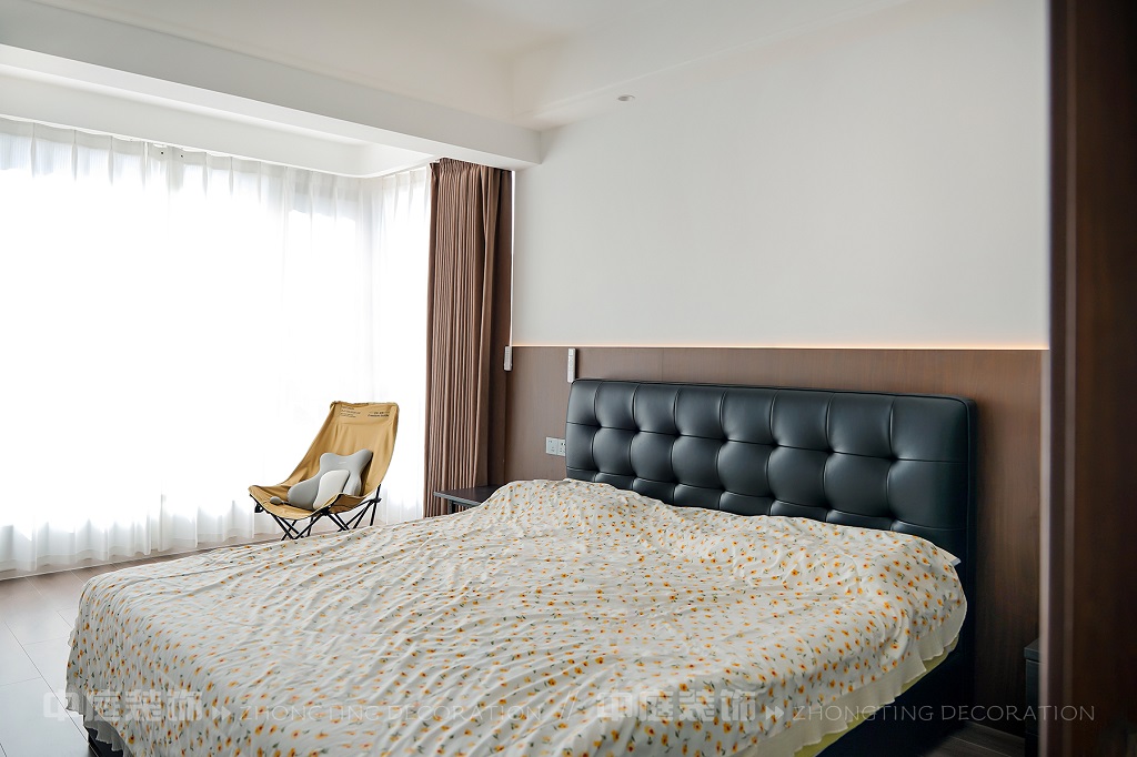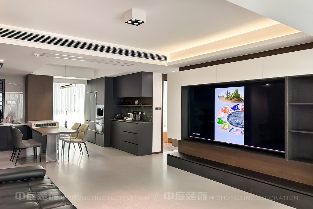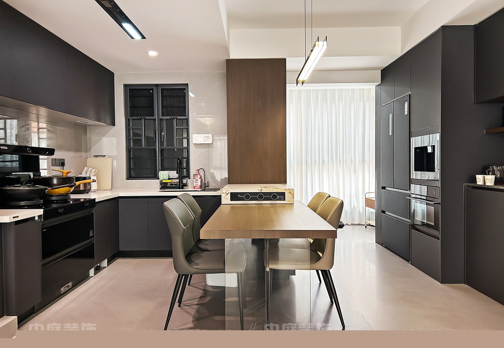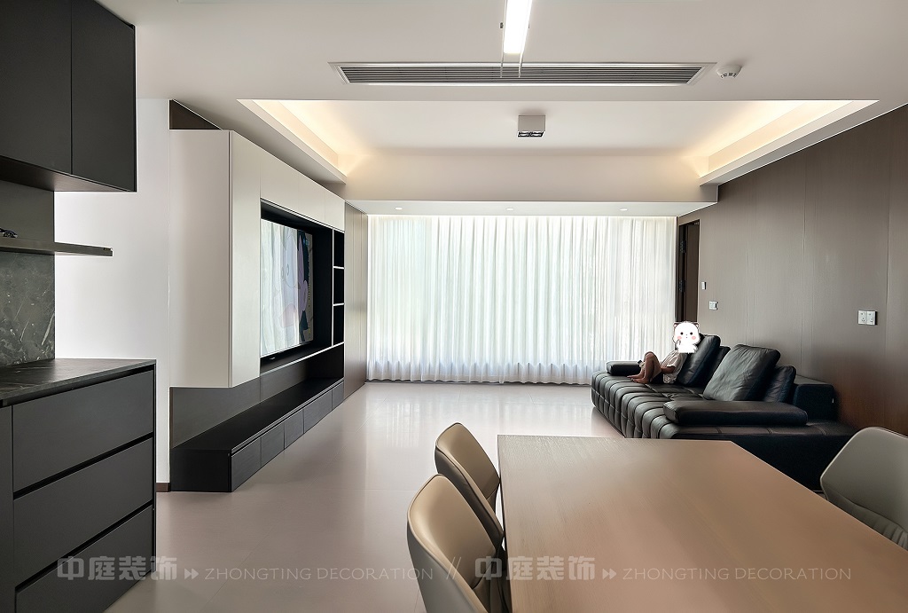 客廳以現(xiàn)代黑白灰極簡風(fēng)格為核心,大面積白紗簾引入自然光線,黑色皮質(zhì)沙發(fā)質(zhì)感高級(jí)。開放式布局,深灰櫥柜與木質(zhì)餐桌形成材質(zhì)對(duì)比,線性吊燈提升精致感,功能與美學(xué)兼具,營造現(xiàn)代簡約的烹飪用餐氛圍。輕柔窗簾與柔和燈光,打造靜謐休息空間。精致的材質(zhì)選擇與合理的功能規(guī)劃,詮釋了“少即是多”的現(xiàn)代簡約居住美學(xué)。